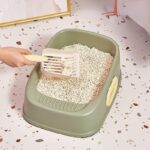 This small semi-closed cat litter box features a convenient sand spoon storage, double handles for easy handling, and a leak-proof design to prevent sand leakage. Made from durable, odorless PP material, it helps control odors while providing ample space for your cat’s comfort.