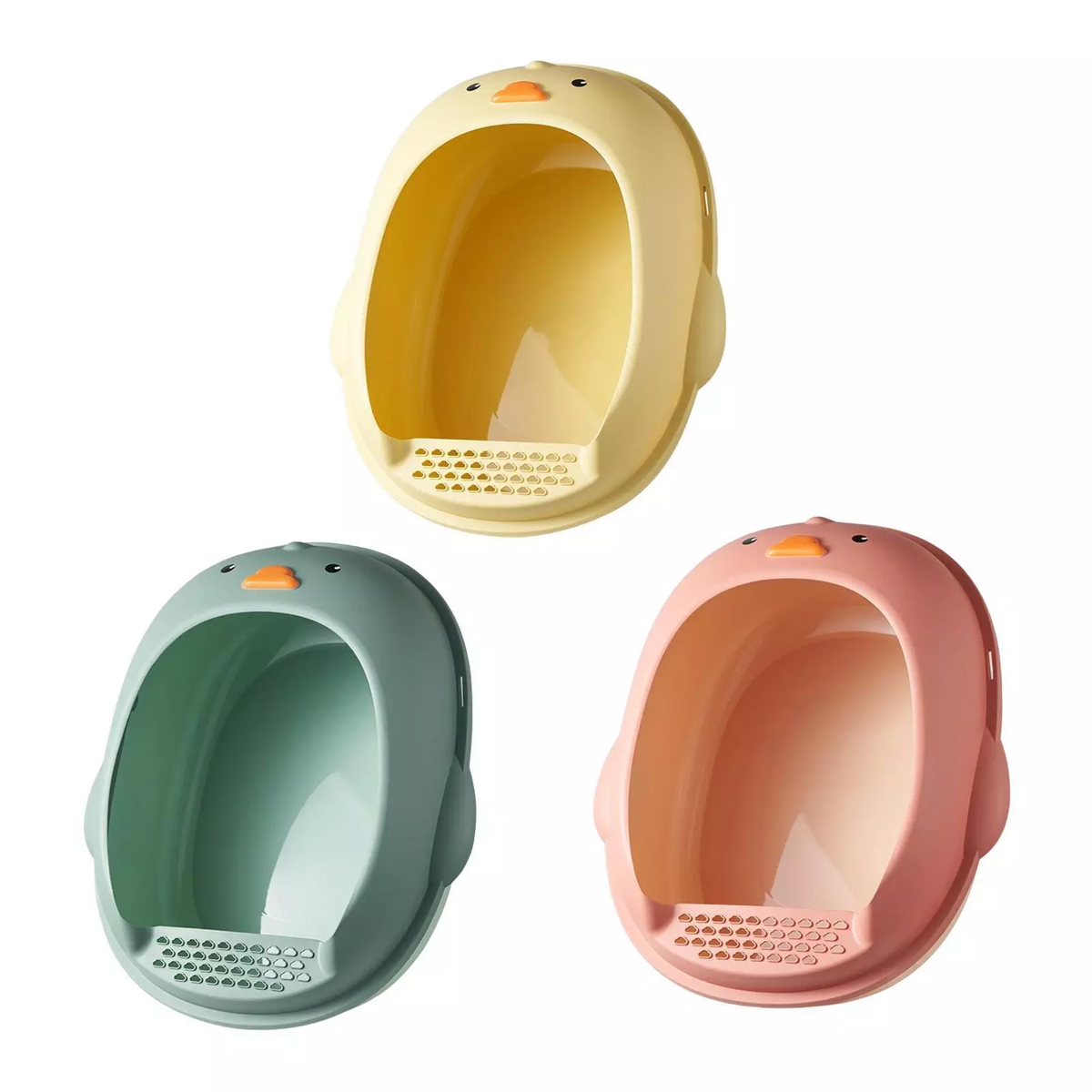 n- Anti-Splashing Design: The unique little duck-shaped pet toilet features an open semi-enclosed design with an added height frame. The inner rolled-up edge helps effectively prevent litter from being scattered around the room, keeping your space clean.