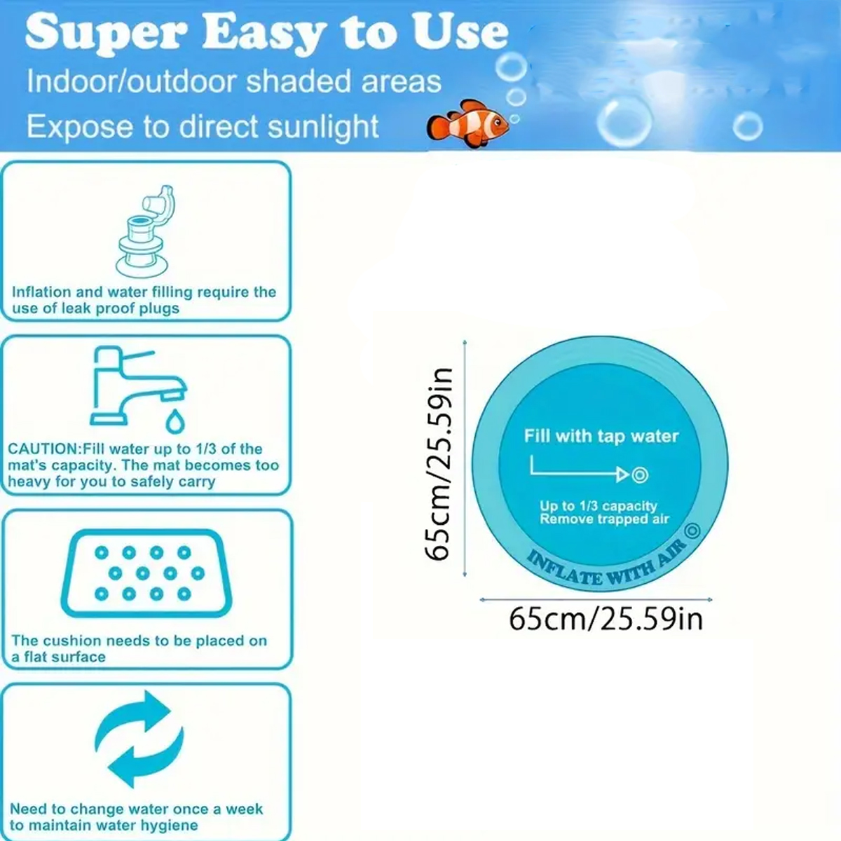 n- Fill with cold or warm water up to 1/3 of the mat’s capacity.