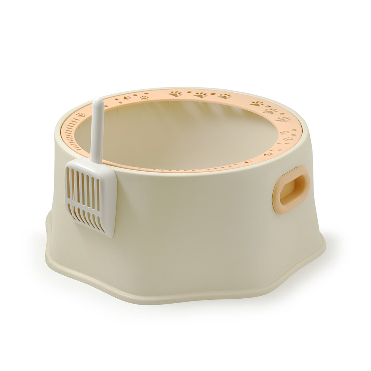 This large round cat litter box features a high rim with paw prints, made of durable, harmless PP material for easy cleaning. It includes a cleaning scoop and convenient side handles for easy portability. Dimensions: 49 cm diameter, 24 cm height.