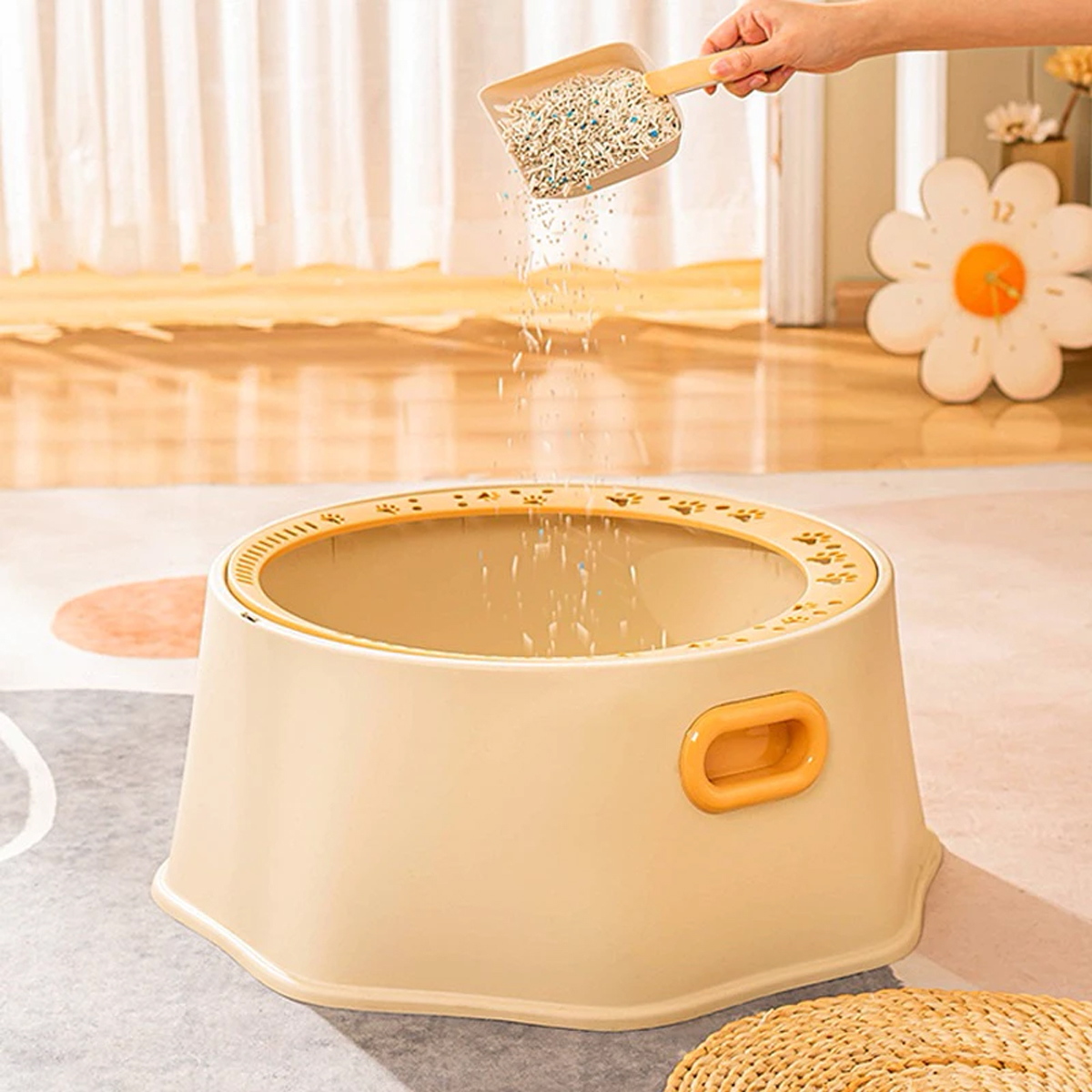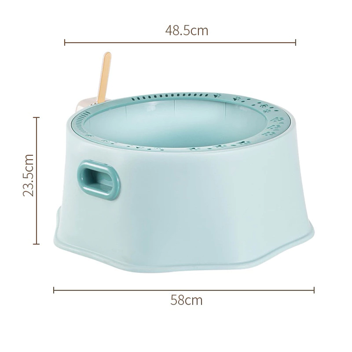 This large round cat litter box features a high rim with paw prints, made of durable, harmless PP material for easy cleaning. It includes a cleaning scoop and convenient side handles for easy portability. Dimensions: 49 cm diameter, 24 cm height.